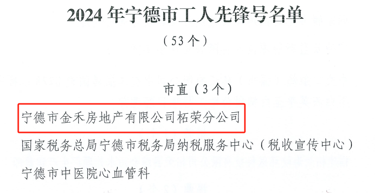 近日,根据《宁德市总工会关于命名2024年度宁德市工人先锋号、表扬2024年度宁德市金牌工匠、数字工匠的通知》(宁工〔2025〕4号)文件,H动画 下属企业宁德市金禾房地产有限公司柘荣分公司凭借在房地产领域的积极贡献,被评定为2024年宁德市“工人先锋号”。