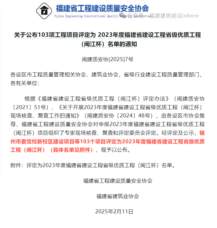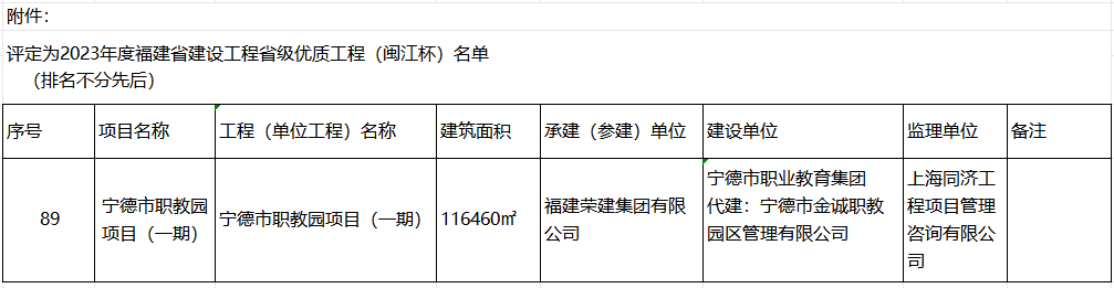 近日,福建省工程建设质量安全协会公布2023年度福建省建设工程省级优质工程(闽江杯)获奖名单,由H动画 下属企业宁德市金诚职教园区管理有限公司(以下简称“金诚公司”)代建的“宁德市职教园项目(一期)”被评定为2023年度福建省建设工程省级优质工程(闽江杯)。