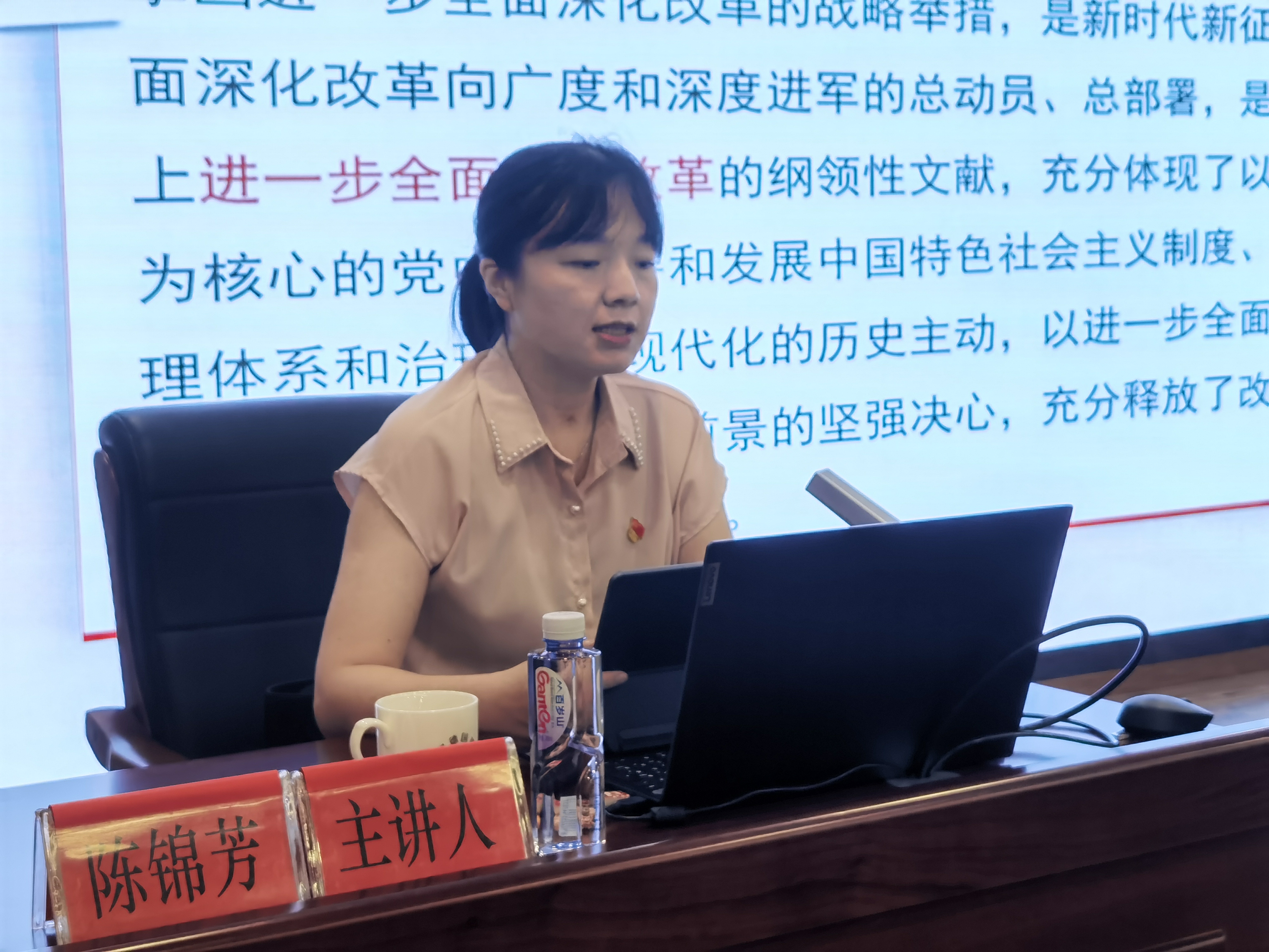 为深入学习习近平总书记在党的二十届三中全会上的重要讲话精神,深刻理解全会提出的一系列重大理论观点、重大工作部署,自觉把思想和行动统一到党中央决策部署上来,8月27日下午,H动画 党委举办“深入学习贯彻党的二十届三中全会精神”专题培训讲座,邀请中共宁德市委党校管理学教研室副主任、副教授陈锦芳同志前来授课。H动画 领导班子成员、各部室负责人、各所属企业党组织主要负责人、党务工作分管领导和国投机关党支部全体党员五十余人聆听讲座。